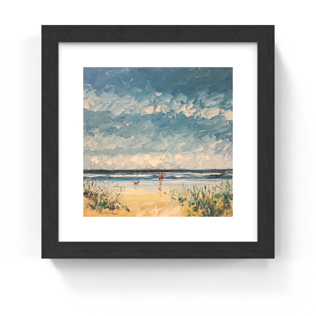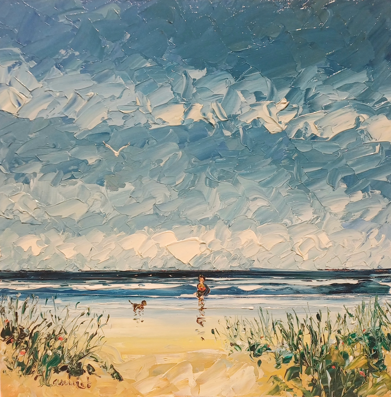 This unique and original contemporary artwork "Amis pour toujours" has been created by the contemporary artist Hanniet. The artist used oil medium on canvas board to create this figurative, small size painting of the beach.