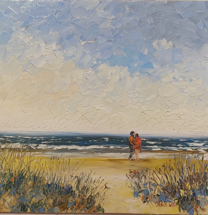 This unique and original contemporary artwork "Amoroso cantabile" was created by contemporary artist Hanniet. The artist used the oil technique to create this small-format painting in the figurative style of a beach scene.