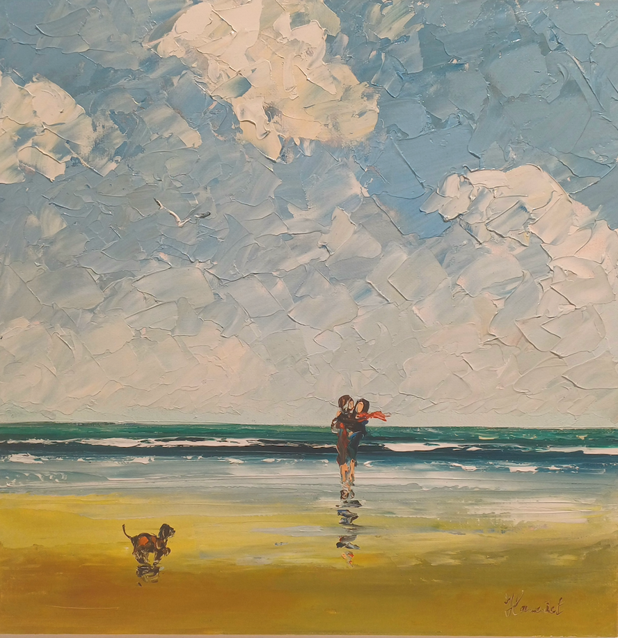 This unique and original contemporary artwork "Amoureux du vent" has been created by the contemporary artist Hanniet. The artist used oil medium on canvas board to create this figurative, small size painting.