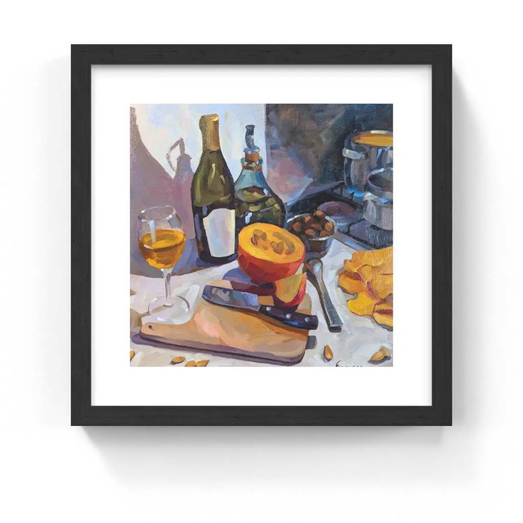 This unique and original contemporary artwork "Feast in the making" on the subjects of still life, has been created by the contemporary artist Danielle Ferguson. The artist used oil medium on canvas to create this figurative, small size painting.