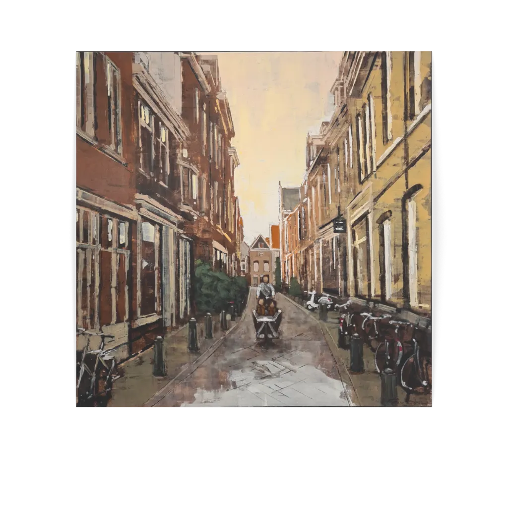 Original artwork "Bicycle on Ridderstraat" by artist Adrien Faveau in size 80x80cm. Medium used is oil on wood .