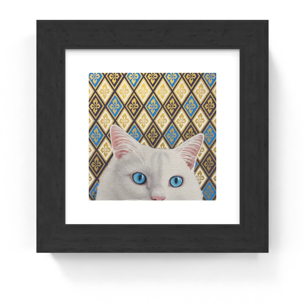 This unique and original contemporary artwork "Cat see You #54" was created by contemporary artist Milie Lairie. The artist used the oil painting technique to create this small-format, realistic-style painting on paper on the theme of animals. The background is a collage of traditional Japanese paper (washi paper).