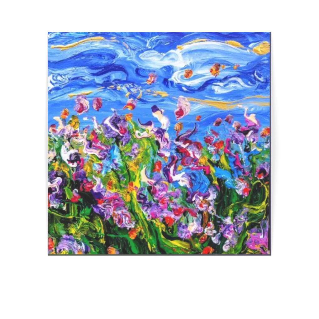 This unique and original contemporary artwork "Windy pink irises" on the subject of flowers has been created by the contemporary artist Florence Amblard. The artist used acrylic medium on canvas to create this large size painting.