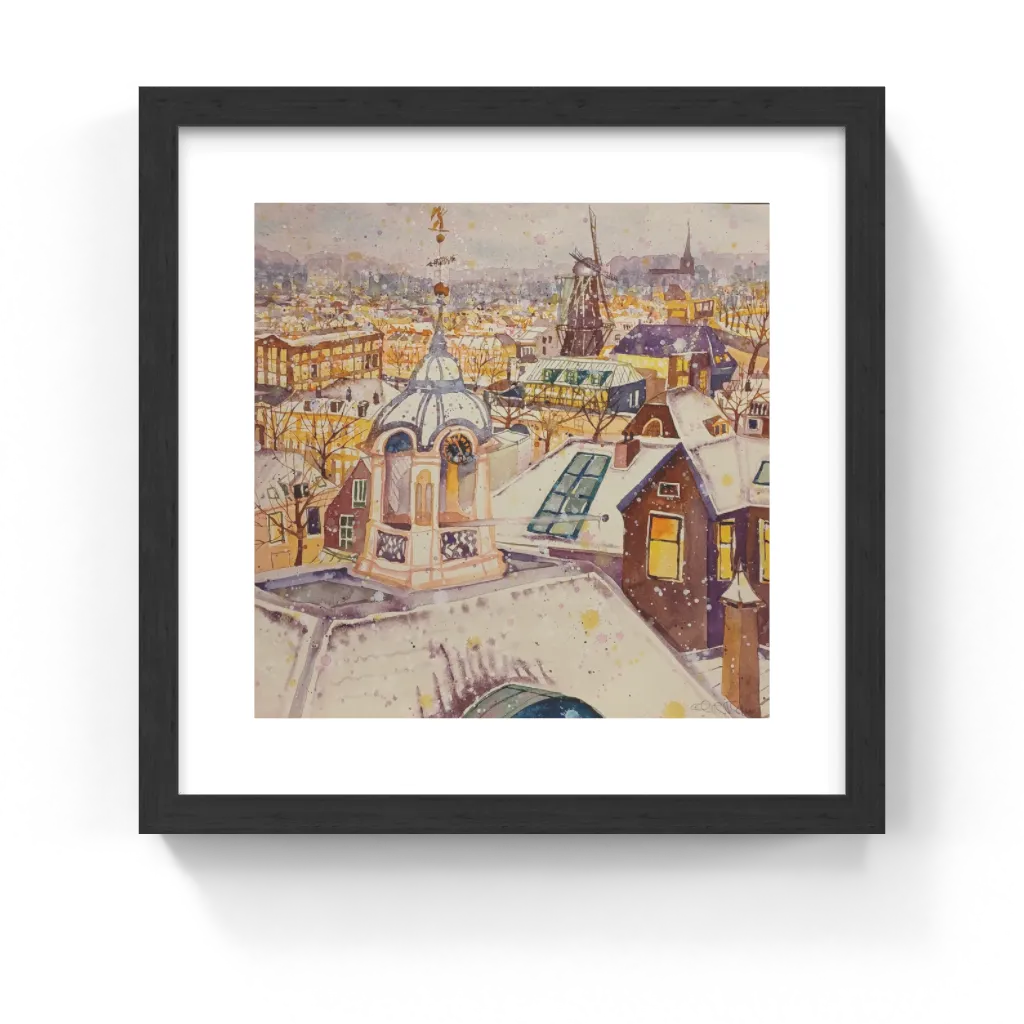 This unique and original contemporary artwork "City at night, Haarlem" has been created by the contemporary artist Edith Thurnherr. The artist used watercolor medium on paper to create this realist, small size painting.