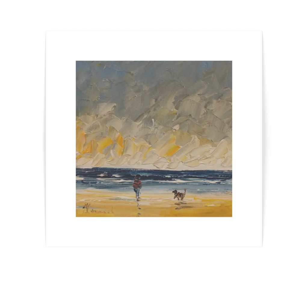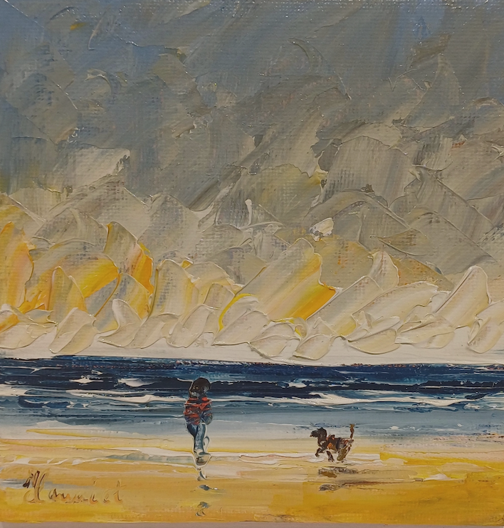 This unique and original contemporary artwork "Complices de toujours" has been created by the contemporary artist Hanniet. The artist used oil medium on canvas board to create this figurative, small size painting of the beach.