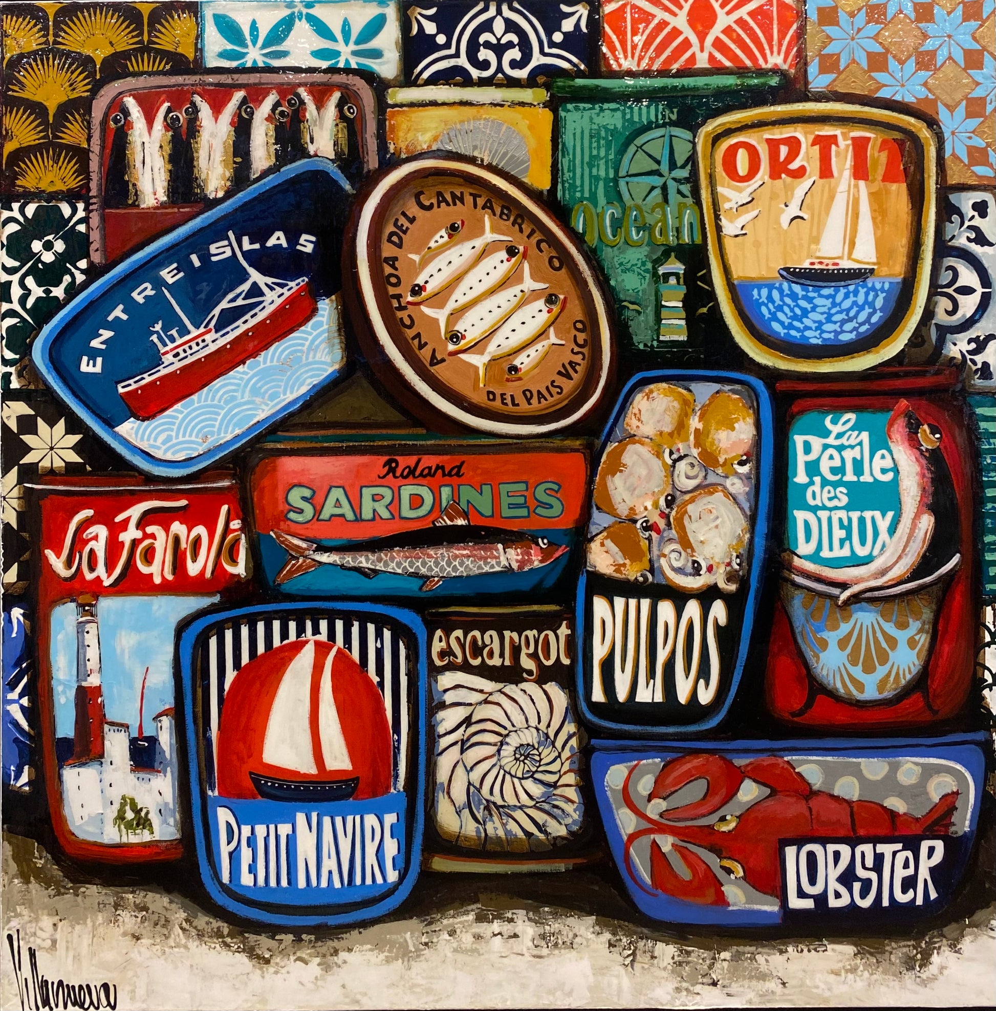 This unique and original contemporary artwork "Conservas" has been created by the contemporary artist Villanueva Puigdelliura Natalia. The artist used mixed medium on Canvas to create this Figurative, Large size painting.