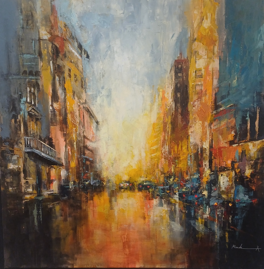 This unique and original contemporary artwork "Day meets night" has been created by the contemporary artist Mande. The artist used oil medium on canvas to create this impressionistic city scape.