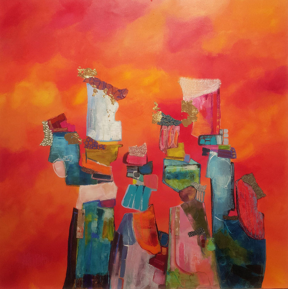 This unique and original contemporary artwork "Deux mamies et leurs petites filles" has been created by the contemporary artist Lau Blou. The artist used acrylic and gluing media to create this abstract, large size painting.