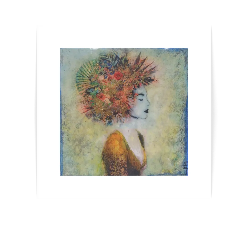 This unique and original contemporary artwork "Dormida" has been created by the contemporary artist Laura Bofill. The artist used acrylic, resin media, and gold leaf to create this figurative, small size painting.