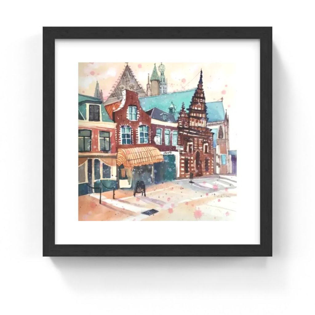 This unique and original contemporary artwork "Haarlem Spekstraat/Grote Houtstraat" has been created by the contemporary artist Edith Thurnherr. The artist used watercolor medium on paper to create this realism, small size painting.