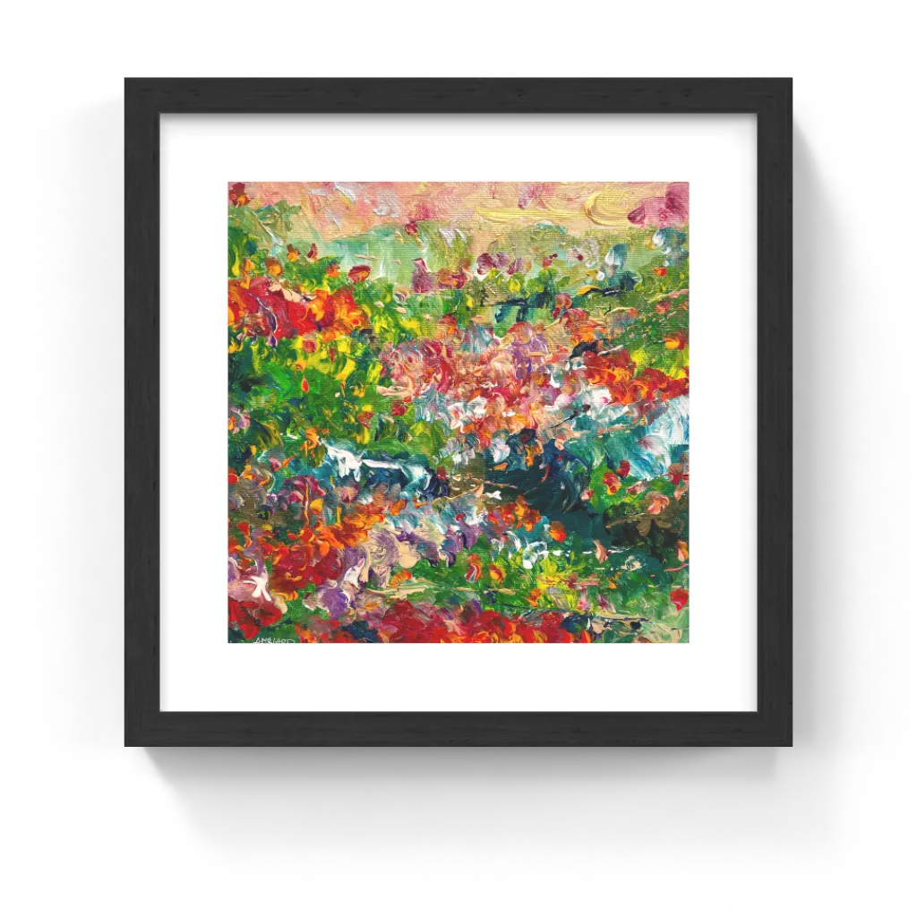 This unique and original contemporary artwork "The flower garden" on the subject of flowers has been created by the contemporary artist Florence Amblard. The artist used acrylic medium on canvas to create this small size painting.
