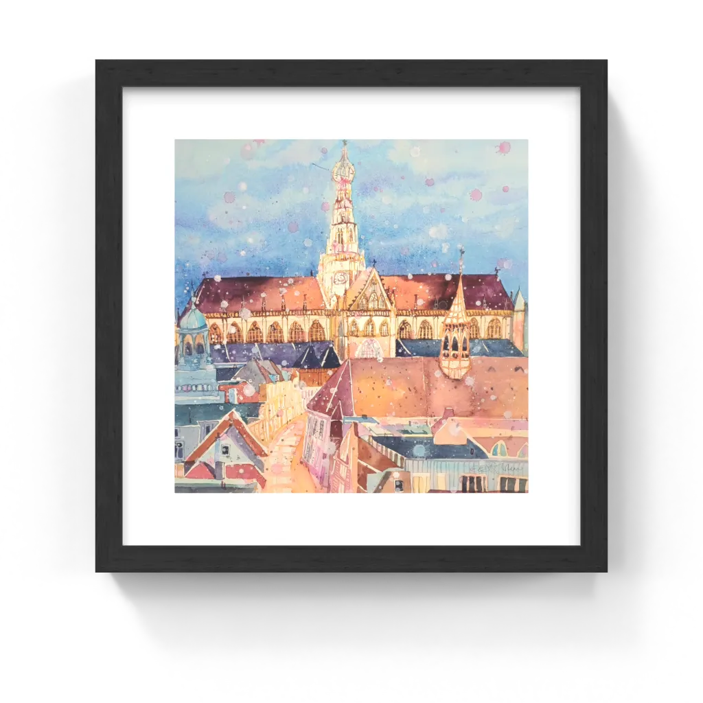 This unique and original contemporary artwork "Grote St. Bavokerk Night, Haarlem " has been created by the contemporary artist Edith Thurnherr. The artist used watercolor medium on paper to create this realist, small size painting.