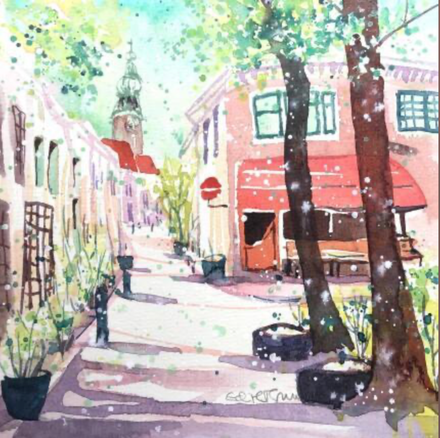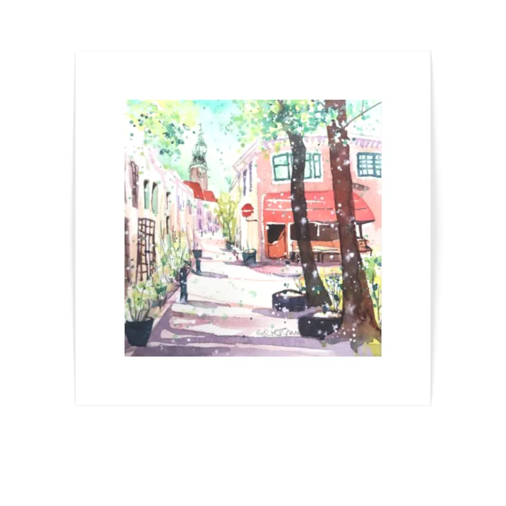 This unique and original contemporary artwork "Haarlem De Vijfhoek" has been created by the contemporary artist Edith Thurnherr. The artist used watercolor medium on paper to create this small size painting of Haarlem.