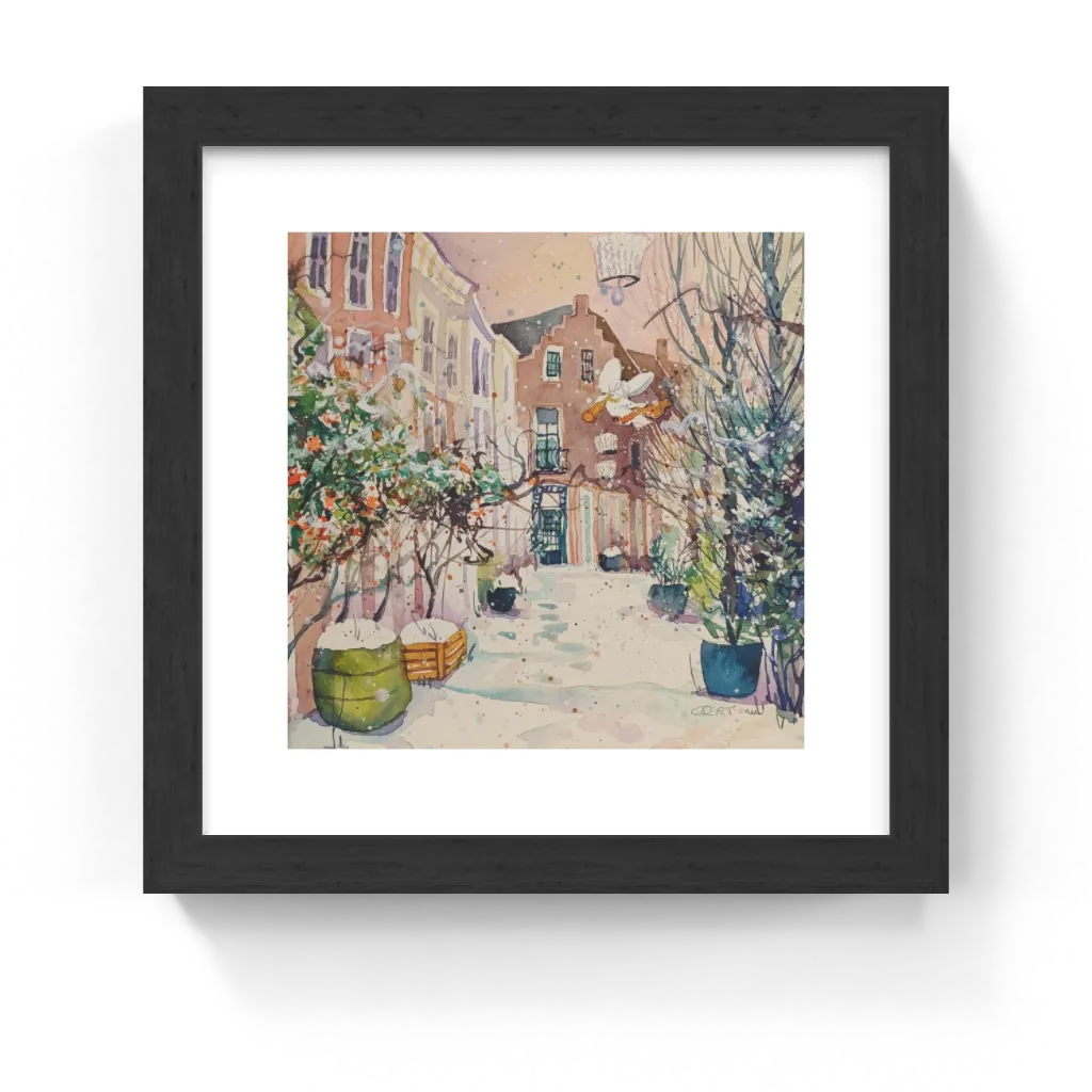 This unique and original contemporary artwork "Korte Houtstraat Winter" has been created by the contemporary artist Edith Thurnherr. The artist used watercolor medium on paper to create this realist, small size painting.