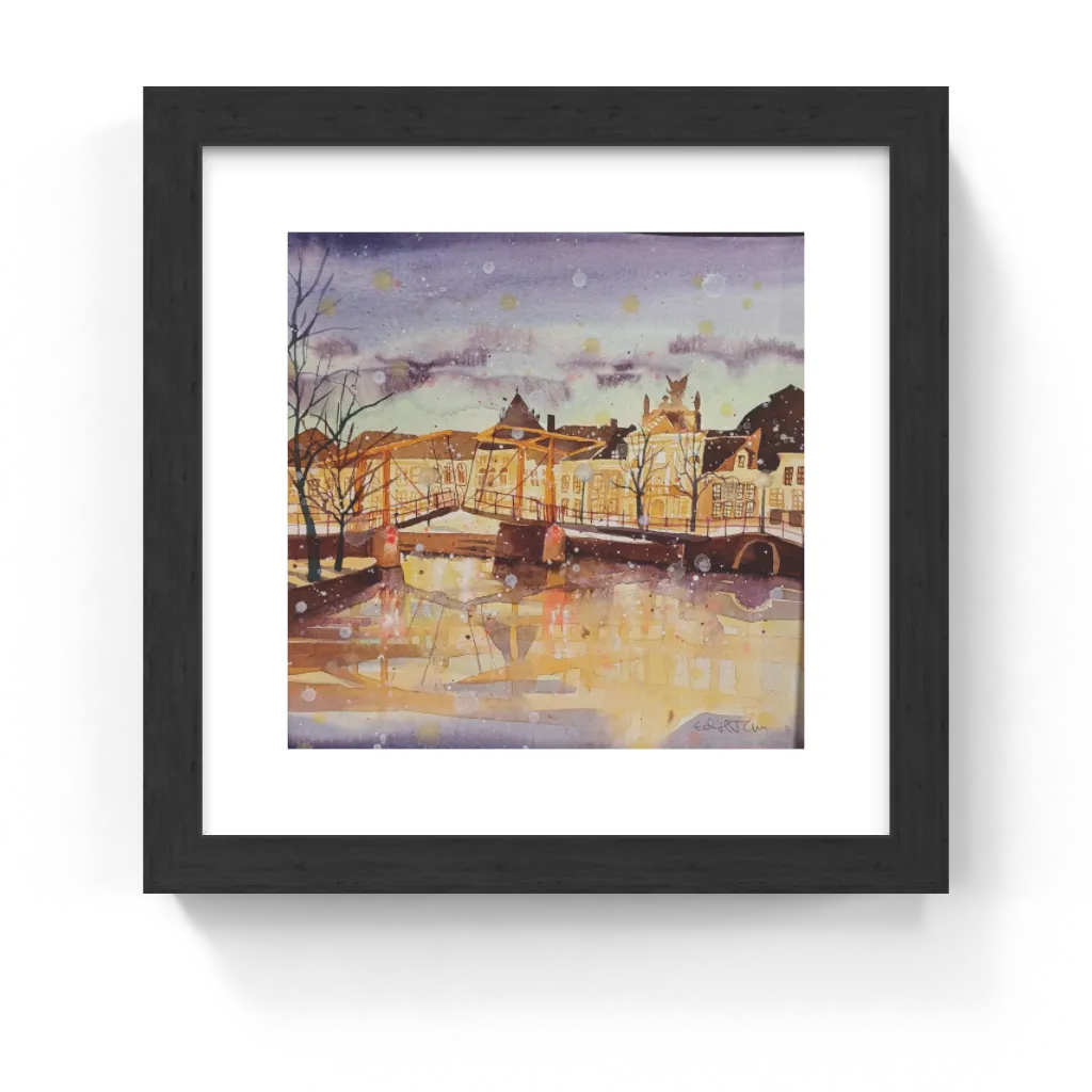 This unique and original contemporary artwork "Gravestenenbrug Night, Haarlem" has been created by the contemporary artist Edith Thurnherr. The artist used watercolor medium on paper to create this realist, small size painting.