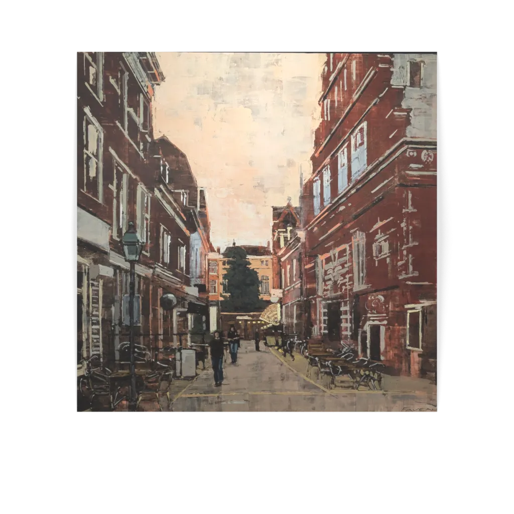 Original artwork "Haarlem, Sunset on Spekstraat" In size 100x100 cm. Medium used is oil on wood.