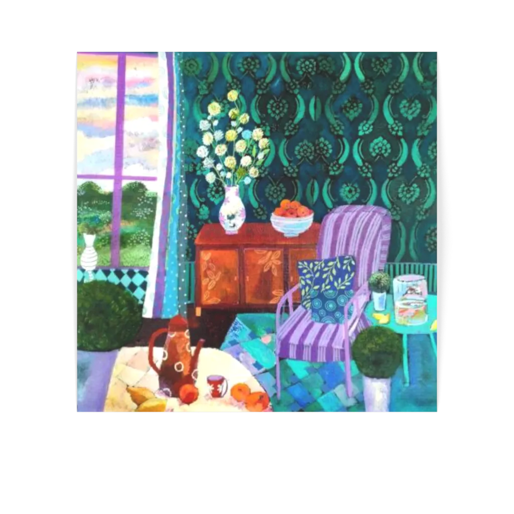 This unique and original contemporary artwork "Intérieur Vert et bleu" on the subjects of Still-life, Landscapes, Life style has been created by the contemporary artist Picini Victoria. The artist used Acrylic medium on Canvas to create this Figurative, Large size painting.