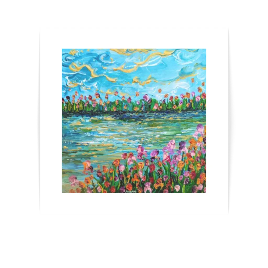 This unique and original contemporary artwork "Irises at the water's edge" on the subject of flowers has been created by the contemporary artist Florence Amblard. The artist used acrylic medium on canvas to create this small size painting.