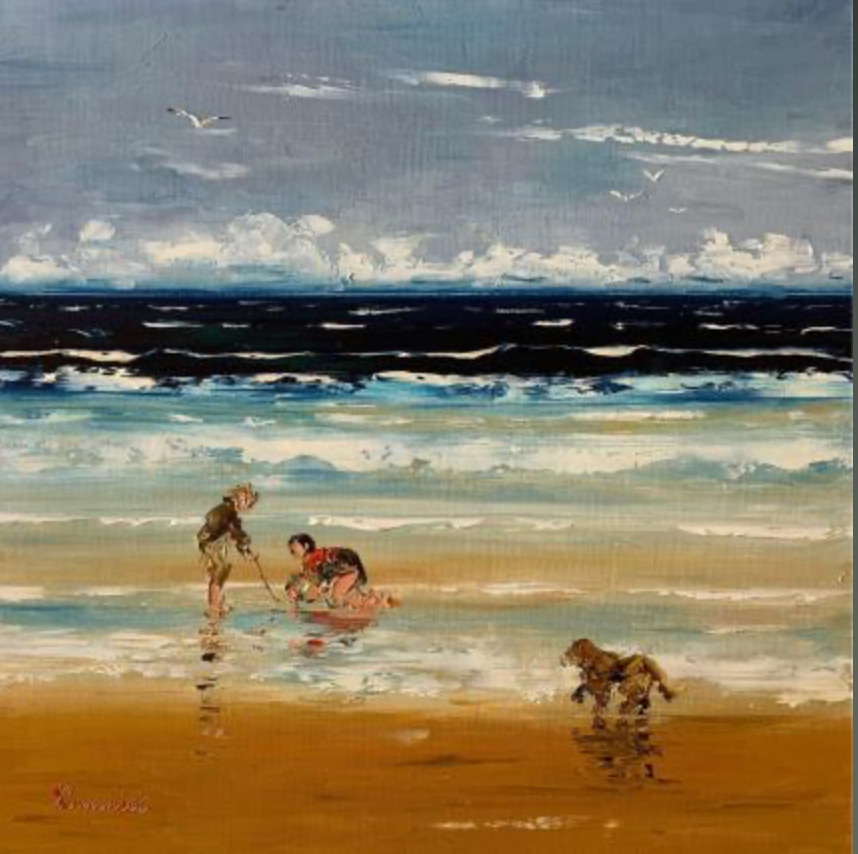 This unique and original contemporary artwork "Jouer, toujours jouer" was created by contemporary artist Hanniet. The artist used the oil technique to create this small-format painting in the figurative style of a beach scene.
