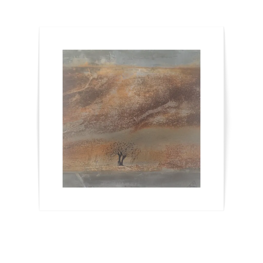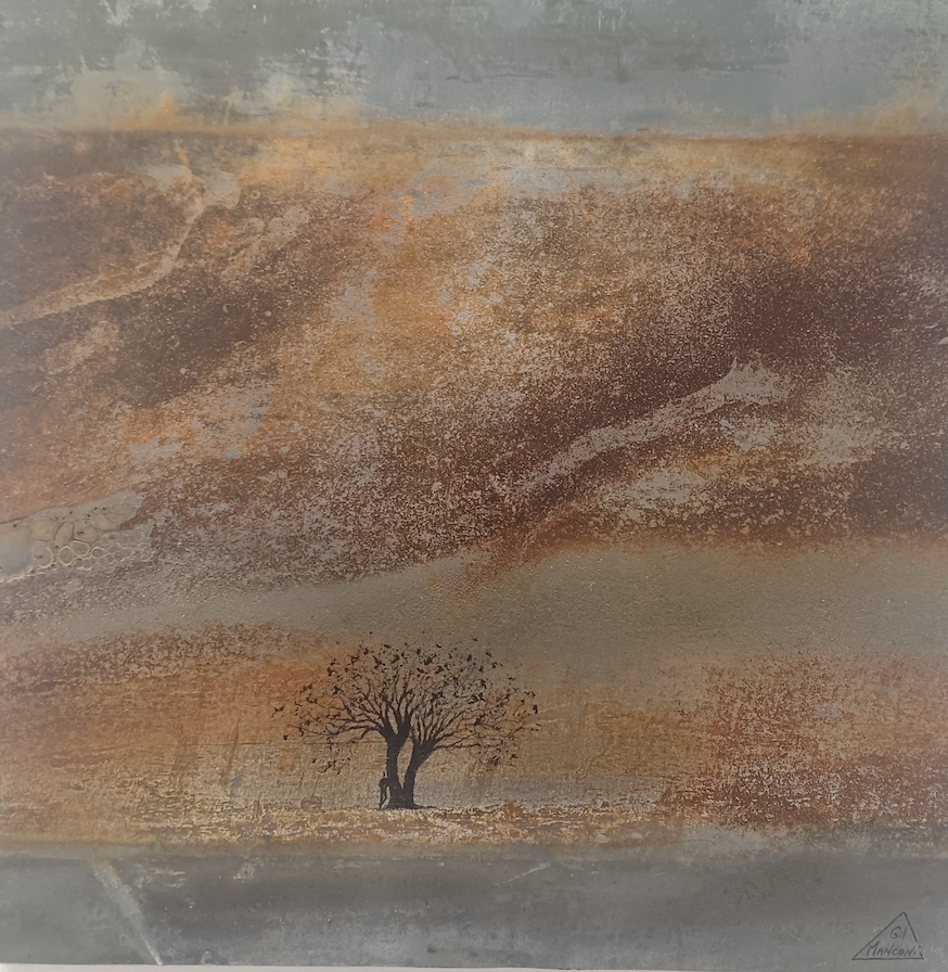 This unique and original contemporary artwork "Kateri" has been created by the contemporary artist Gil Manconi. The artist used metal, fire, chemicals, and paint to create this small size painting.