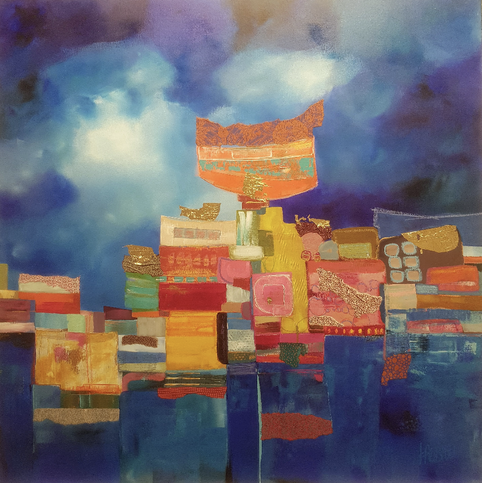 This unique and original contemporary artwork "La grande coupole de l'été" has been created by the contemporary artist Lau Blou. The artist used acrylic and gluing media to create this abstract, large size painting.