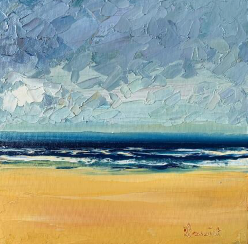 This unique and original contemporary artwork "La morsure du silence" has been created by the contemporary artist Hanniet. The artist used oil medium on canvas board to create this figurative, small size painting of the beach.