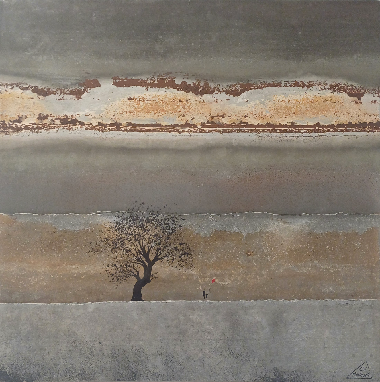 This unique and original contemporary artwork "Lacinia" has been created by the contemporary artist Gil Manconi. The artist used metal, fire, chemicals, and paint to create this small size painting.