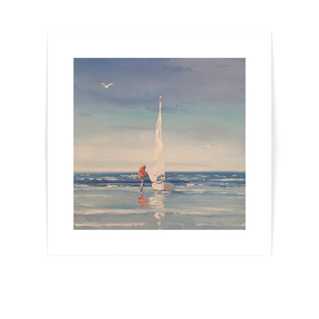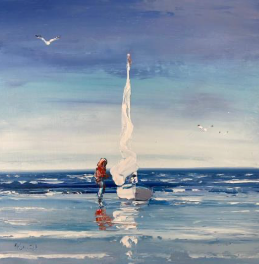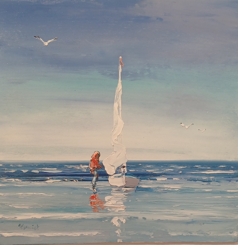 This unique and original contemporary artwork "L'amour du vent" has been created by the contemporary artist Hanniet. The artist used oil medium on canvas board to create this figurative, small size painting.