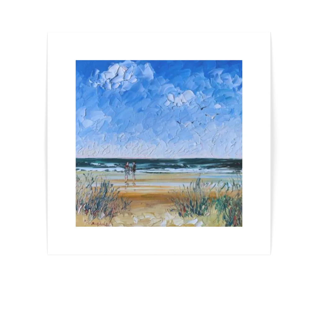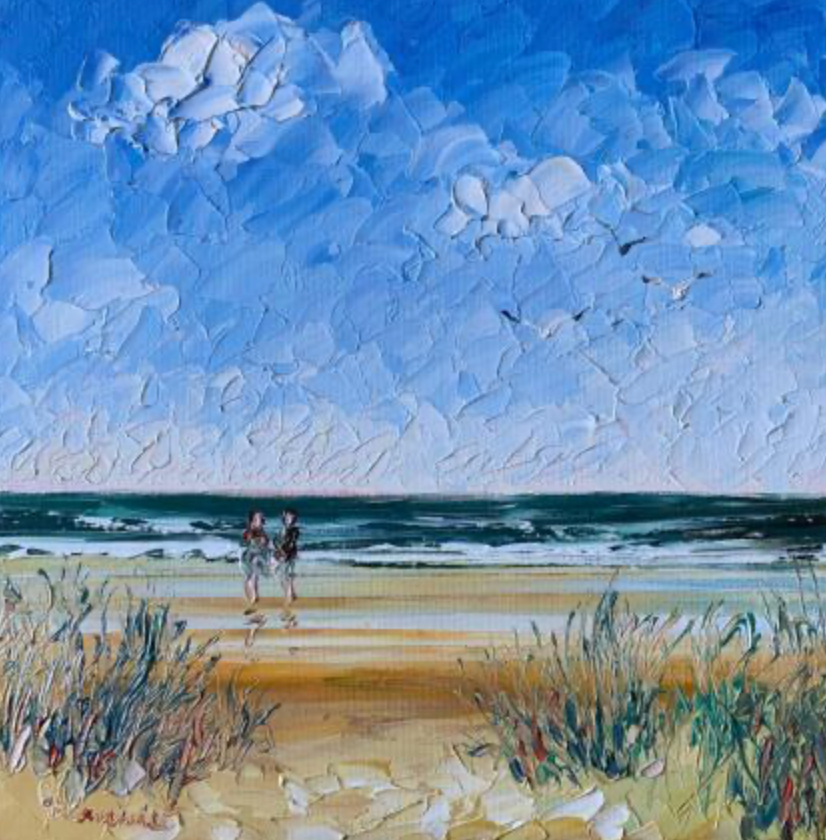 This unique and original contemporary artwork "Le réconfort des confidences" has been created by the contemporary artist Hanniet. The artist used oil medium on canvas board to create this figurative, small size painting of the beach.