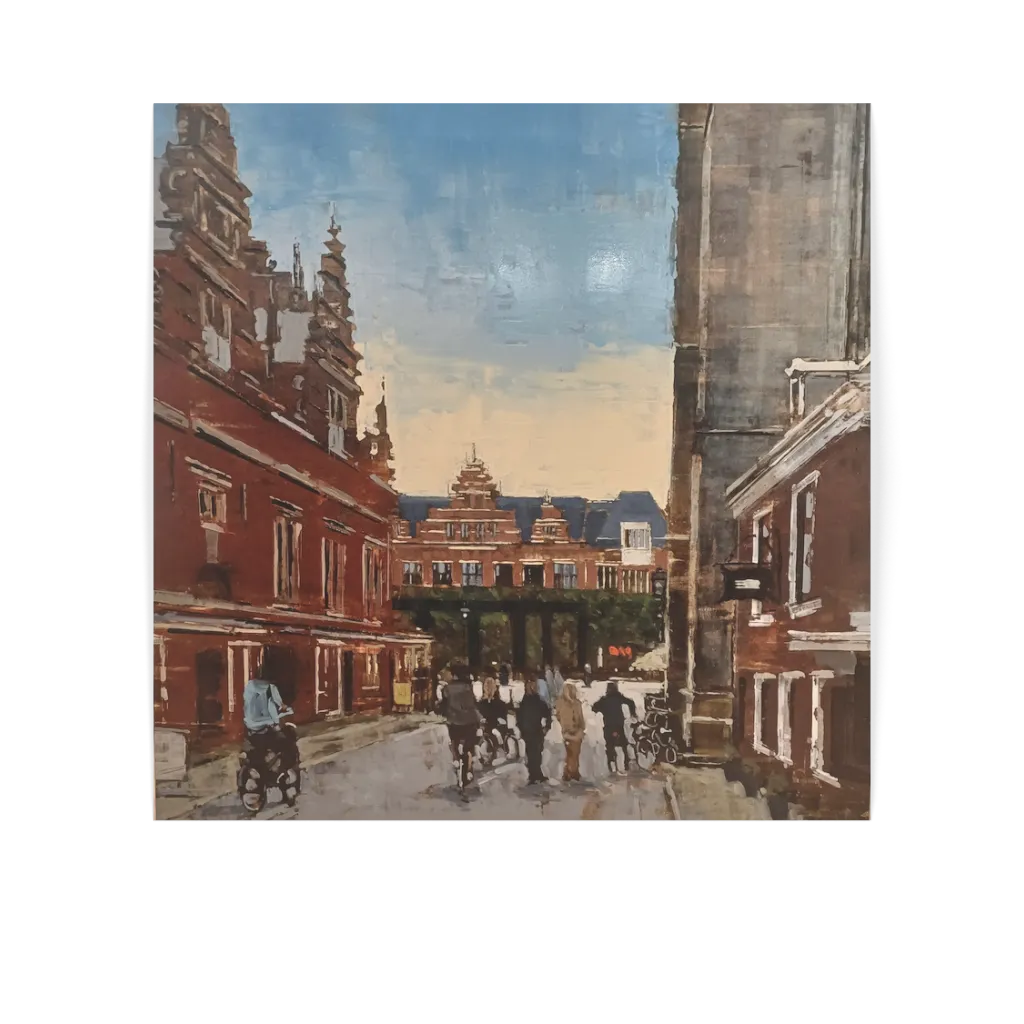 Original artwork "Haarlem, Lepelstraat Walkers" by artist Adrien Faveau in size 80x80 cm. Medium used is oil on wood .
