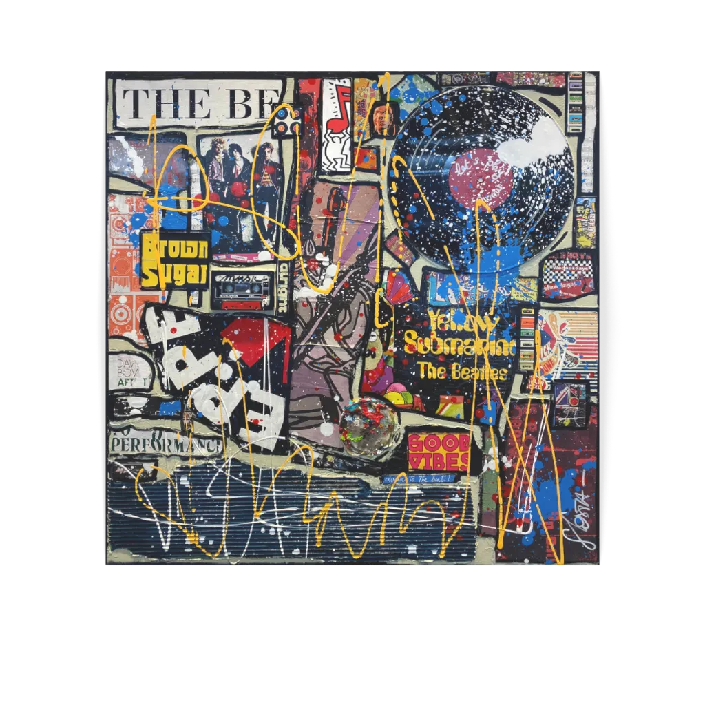 This unique and original contemporary artwork "Let's play !" on the subject of Music has been created by the contemporary artist Costa Sophie. The artist used Acrylic, Gluing, Upcycling media on Canvas to create this Pop-art, Large size painting.