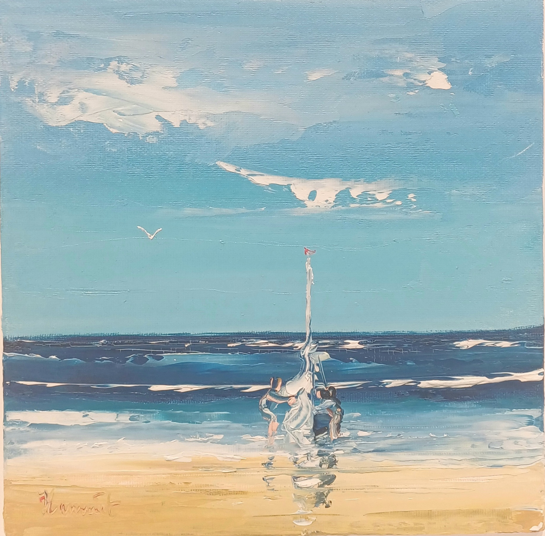 This unique and original contemporary artwork "L'imitation du vent" has been created by the contemporary artist Hanniet. The artist used oil medium on canvas board to create this figurative, small size painting of the beach.