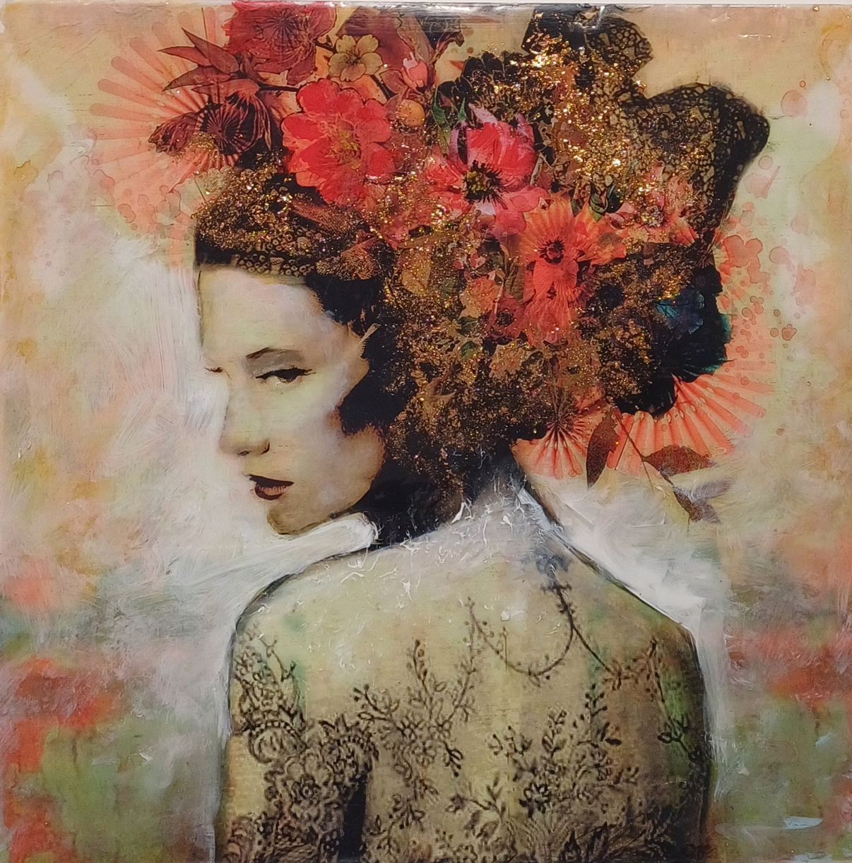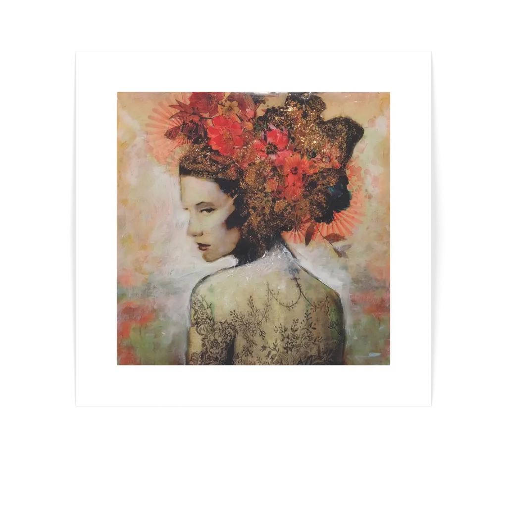This unique and original contemporary artwork "Marta III" has been created by the contemporary artist Laura Bofill. The artist used acrylic, resin media, and rose leaf to create this figurative, small size painting.