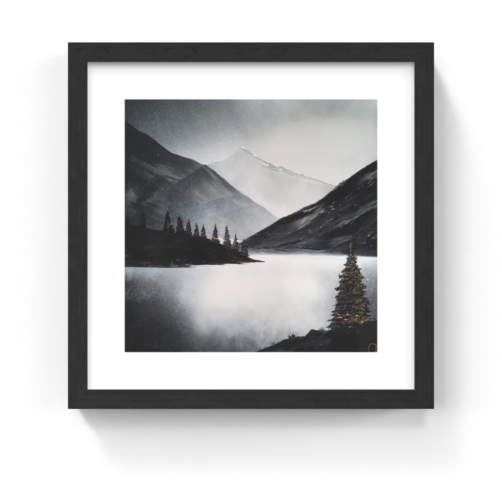 Original artwork "Mountain and lake" by artist Julien Rey. Mixed media on paper in size 36 x 36 cm.