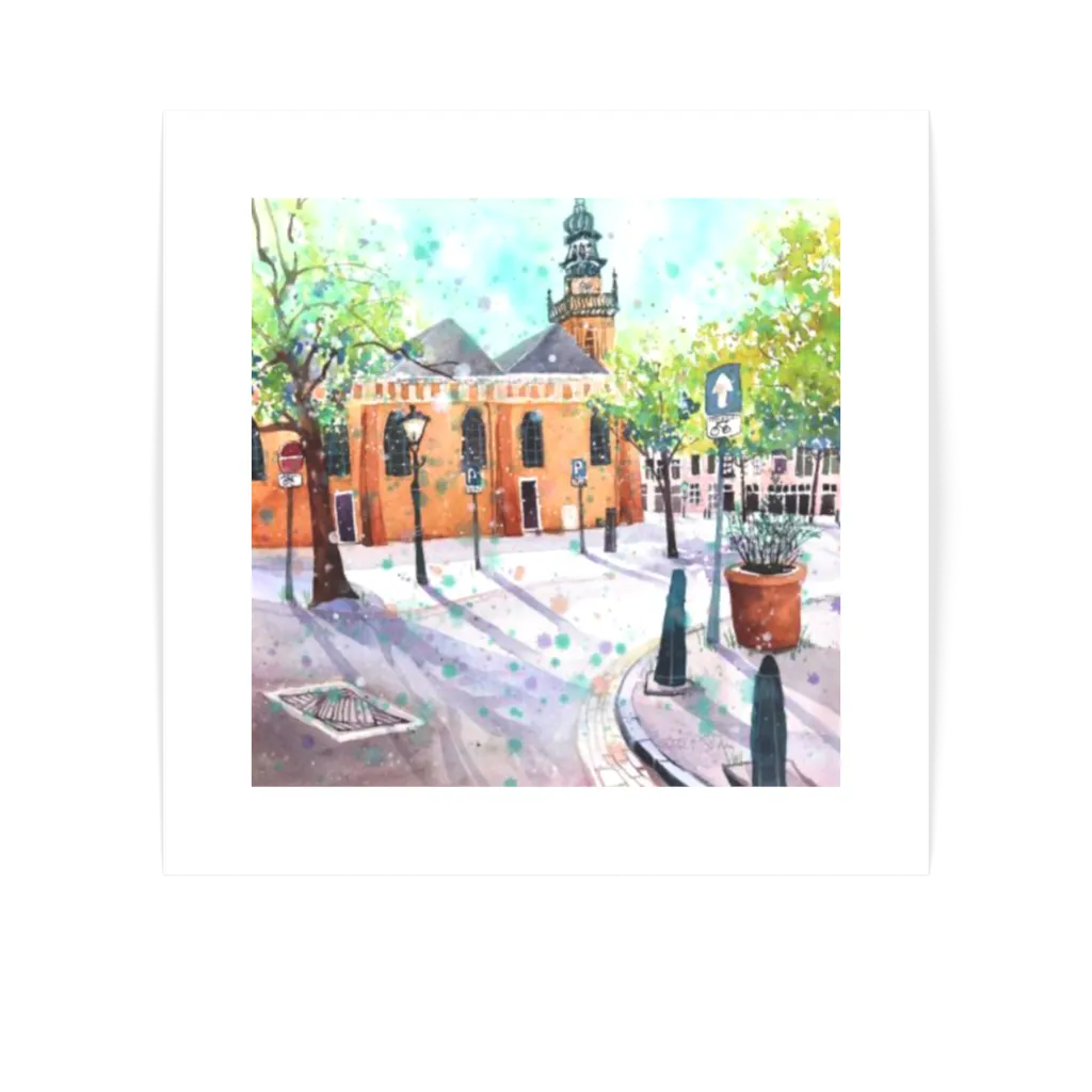 This unique and original contemporary artwork "Nieuwe Kerksplein" has been created by the contemporary artist Edith Thurnherr. The artist used watercolor medium on paper to create this small size painting of Haarlem.