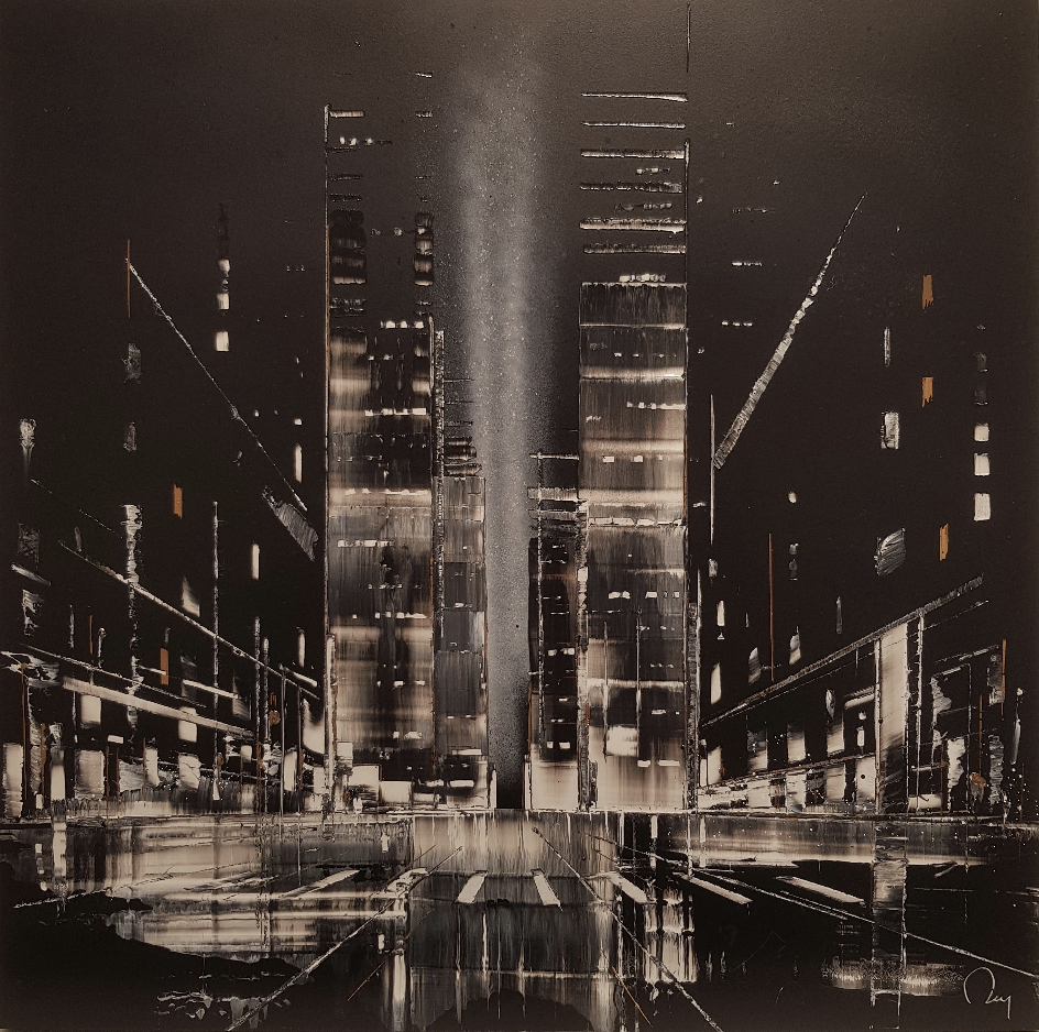 This unique and original contemporary artwork "Night light" has been created by the contemporary artist Julien Rey. The artist used mixed medium with gold leaf to create this figurative large size painting.