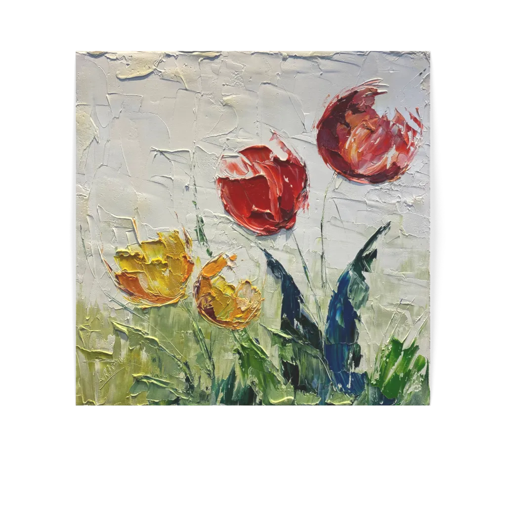 This unique and original contemporary artwork "ORANGE AND RED TULIP" was created by contemporary artist Laura Rose. The artist used the oil technique to create this large format painting on canvas in the figurative style.
