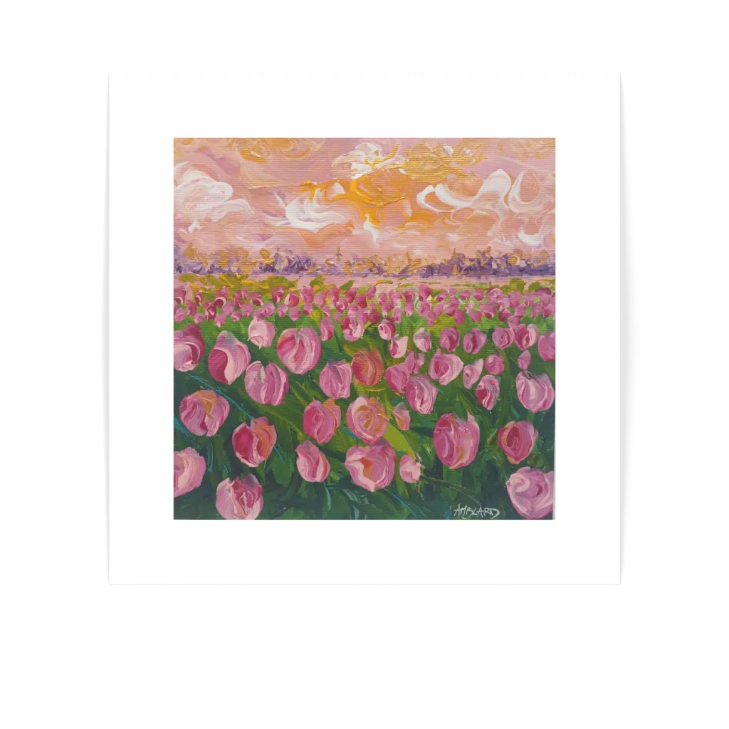 This unique and original contemporary artwork "Pink tulips field" on the subject of flowers has been created by the contemporary artist Florence Amblard. The artist used acrylic medium on canvas to create this small size painting.