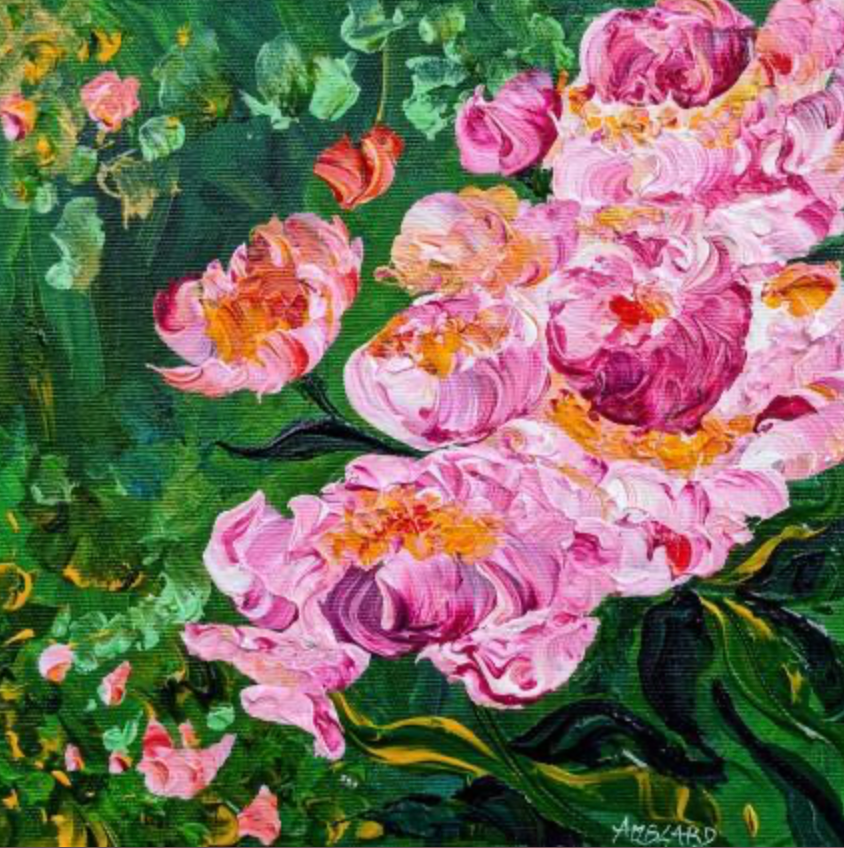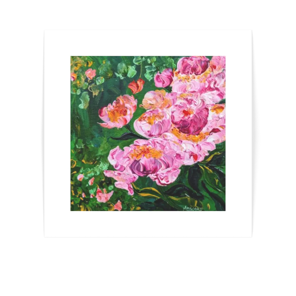This unique and original contemporary artwork "Pivoines roses" on the subject of flowers has been created by the contemporary artist Florence Amblard. The artist used acrylic medium on canvas to create this small size painting.
