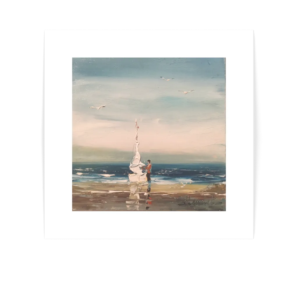 This unique and original contemporary artwork "Retour au bercail sur la plage" has been created by the contemporary artist Hanniet. The artist used oil medium on canvas board to create this figurative, small size painting of the beach.