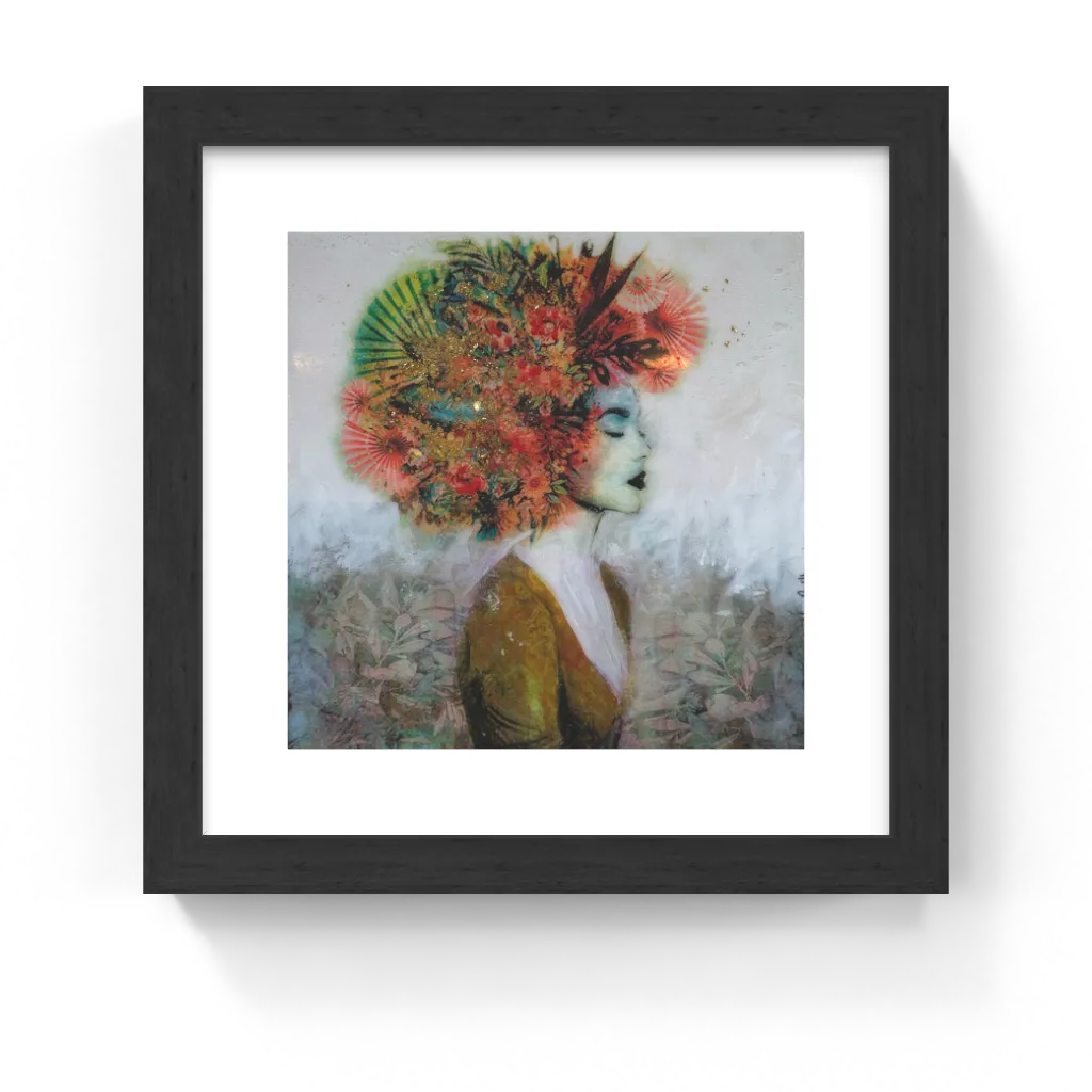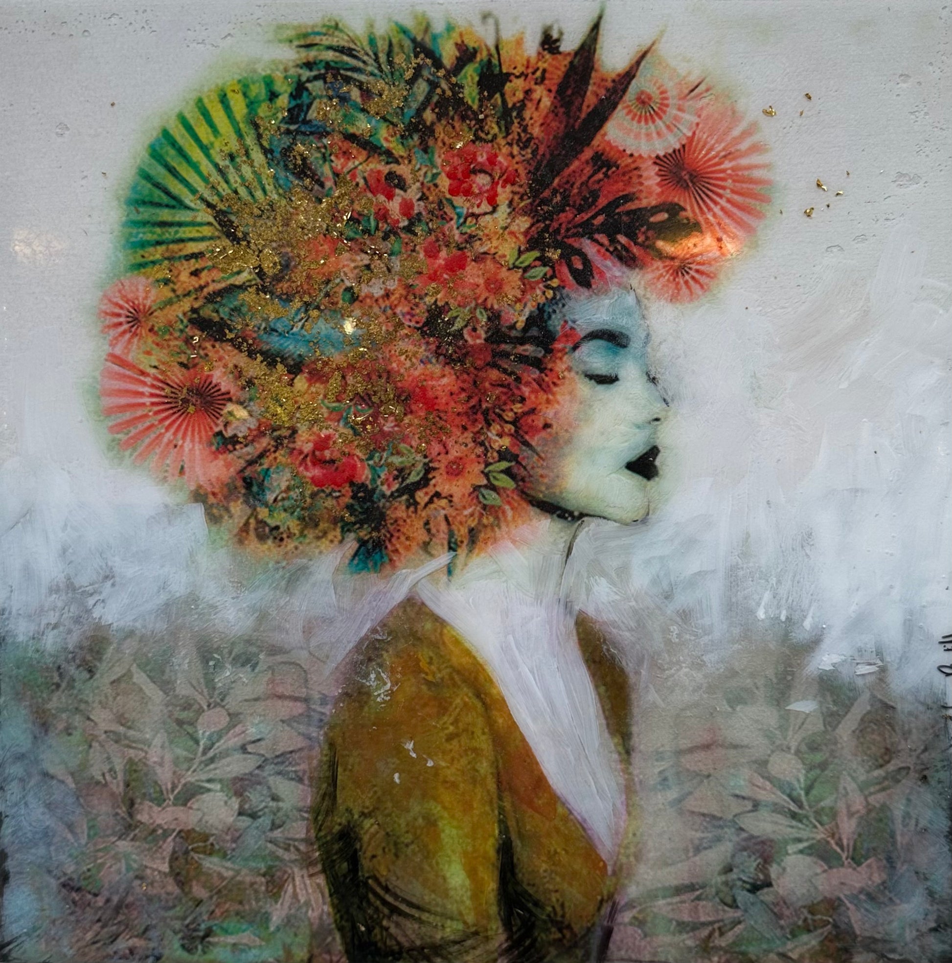 This unique and original contemporary artwork "Serenor" has been created by the contemporary artist Laura Bofill. The artist used acrylic, resin, and gold leaf to create this figurative, small size artwork.