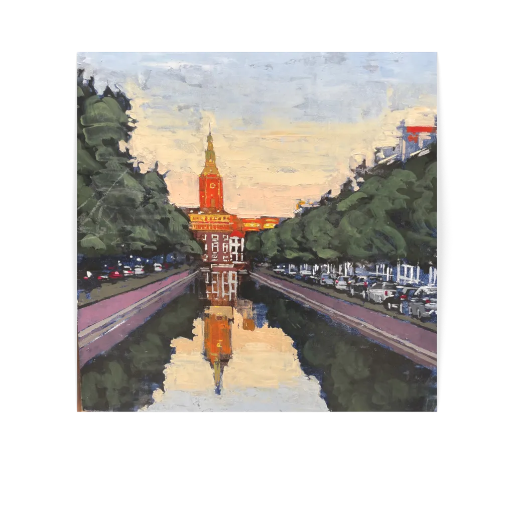 This unique and original contemporary artwork "60x60 Sunset on Grote Kerk" on the subject of Urban has been created by the contemporary artist Faveau Adrien. The artist used Oil medium to create this Figurative, Large size painting.