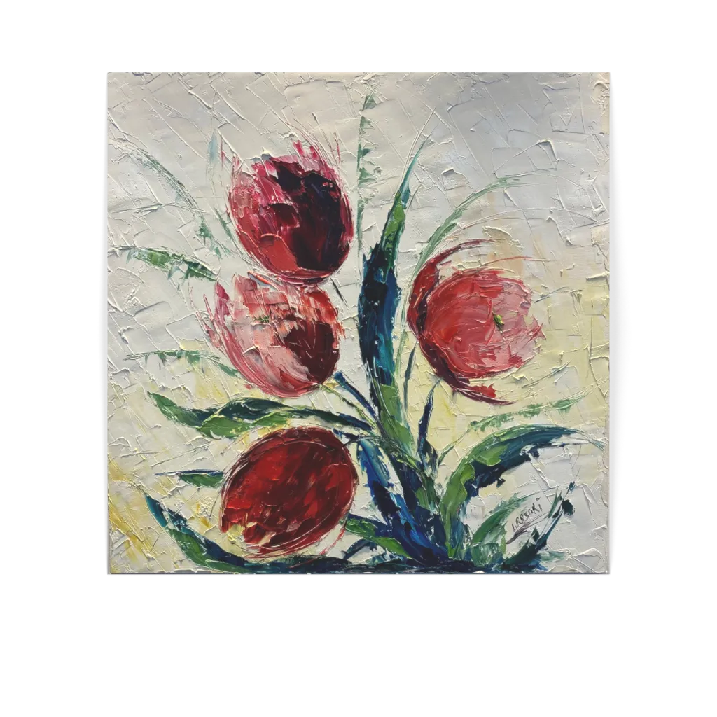 This unique and original contemporary artwork "TULIPE ROSE APRIL" was created by contemporary artist Laura Rose. The artist used the oil technique to create this large format painting on canvas in a figurative style.