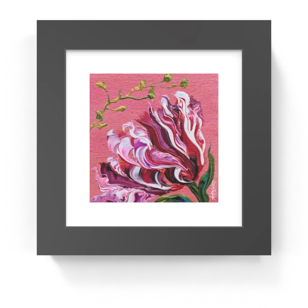 This unique and original contemporary artwork "Tulipe sur fond rose" was created by contemporary artist Florence Amblard. The artist used various painting techniques to create this small-format painting in a singular style.