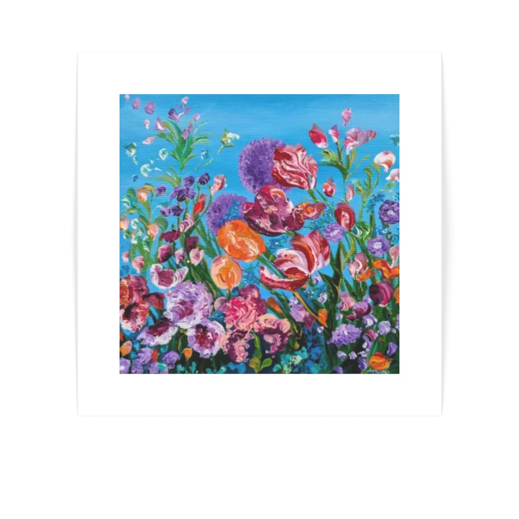 This unique and original contemporary artwork "Tulipes, iris et fleurs printanières" on the subject of flowers has been created by the contemporary artist Florence Amblard. The artist used acrylic medium on canvas to create this small size painting.