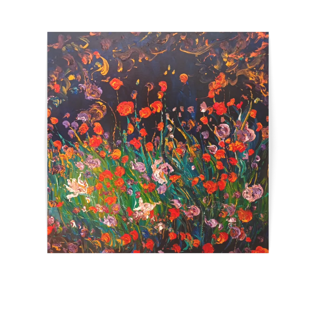 This unique and original contemporary artwork "Tulips and poppies in the enchanted garden" on the subject of flowers has been created by the contemporary artist Florence Amblard. The artist used acrylic medium on canvas to create this large size painting.