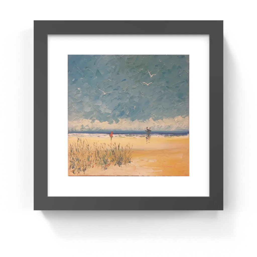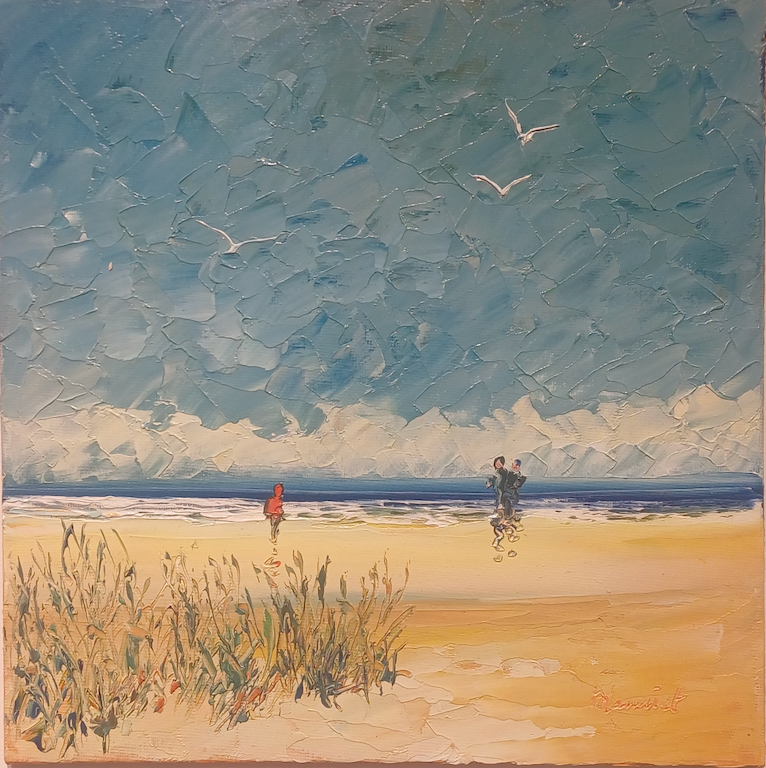 This unique and original contemporary artwork "Famille au vent" has been created by the contemporary artist Hanniet. The artist used oil medium on canvas board to create this figurative, small size painting of the beach.