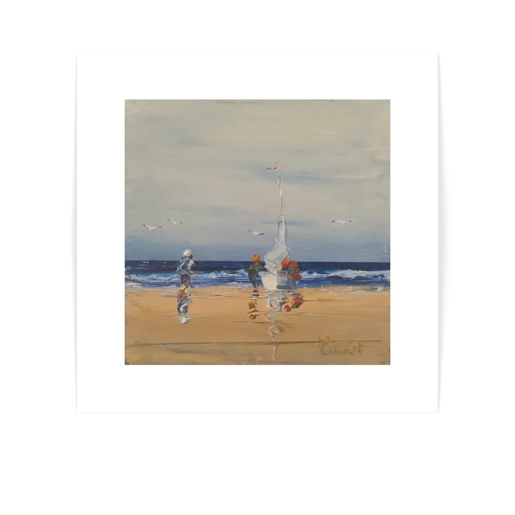 This unique and original contemporary artwork "Voyageurs" has been created by the contemporary artist Hanniet. The artist used oil medium on canvas board to create this figurative, small size painting of the beach.