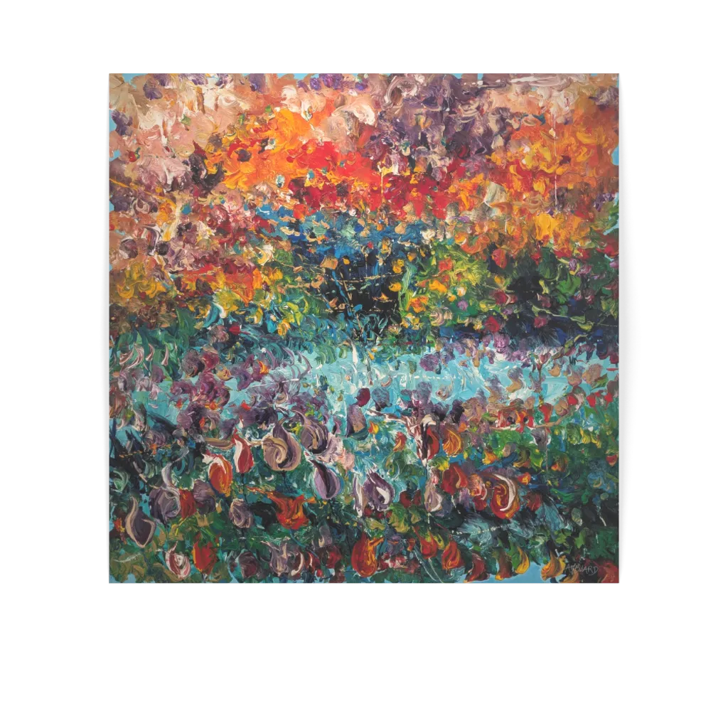 This unique and original contemporary artwork "Wild tulips in Eden's garden" on the subject of flowers has been created by the contemporary artist Florence Amblard. The artist used acrylic medium on canvas to create this small size painting.